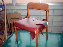 この椅子は、座枠を回って裏の内側に張りとめていきます。 座板を包むのと違って角を3度も回ります。見えないとはいえ、裏側も見栄えなので、かなり緊張しました。 |