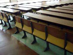 よくある大学の講義講堂の椅子です。 木製の座板を取り外し、ウレタンを積んでPVCで上張りしました。