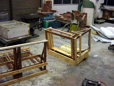 側板を張り付けて、ひとまずの木枠完成といったところです。 ここで、座と背のバネが沈んだ時に木枠に干渉しないかどうか・・・ そして、仕上がりまでの工程を想像しながら、作業上の見落としがないかをチェックします。 |